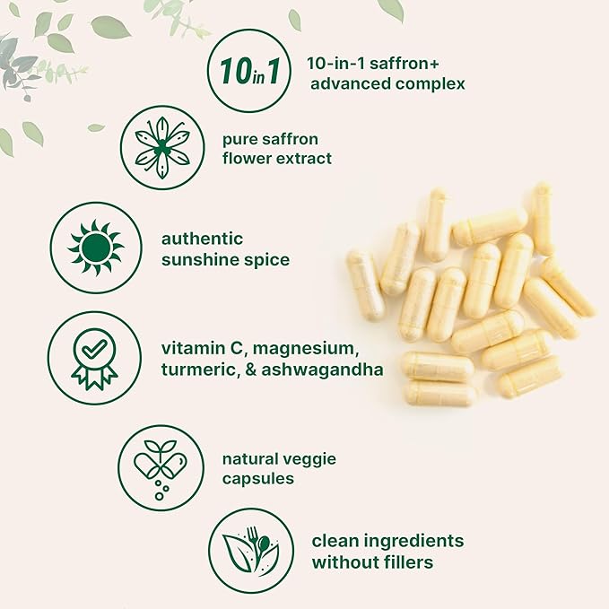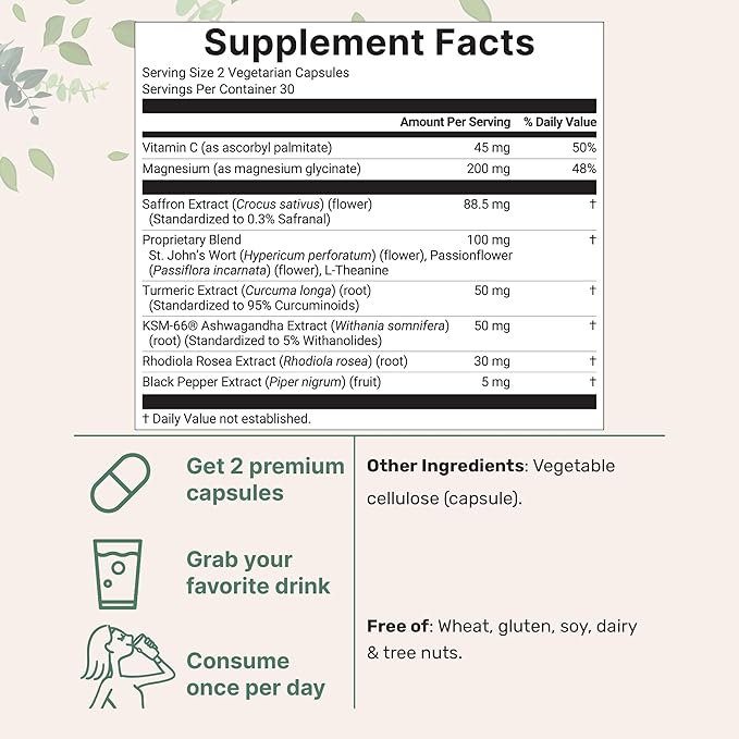 Saffron, fat-soluble vitamin C, magnesium glycinate, proprietary blend, passionflower, l-theanine, 95% turmeric, KSM-66 ashwagandha, rhodiola rosea, and black pepper